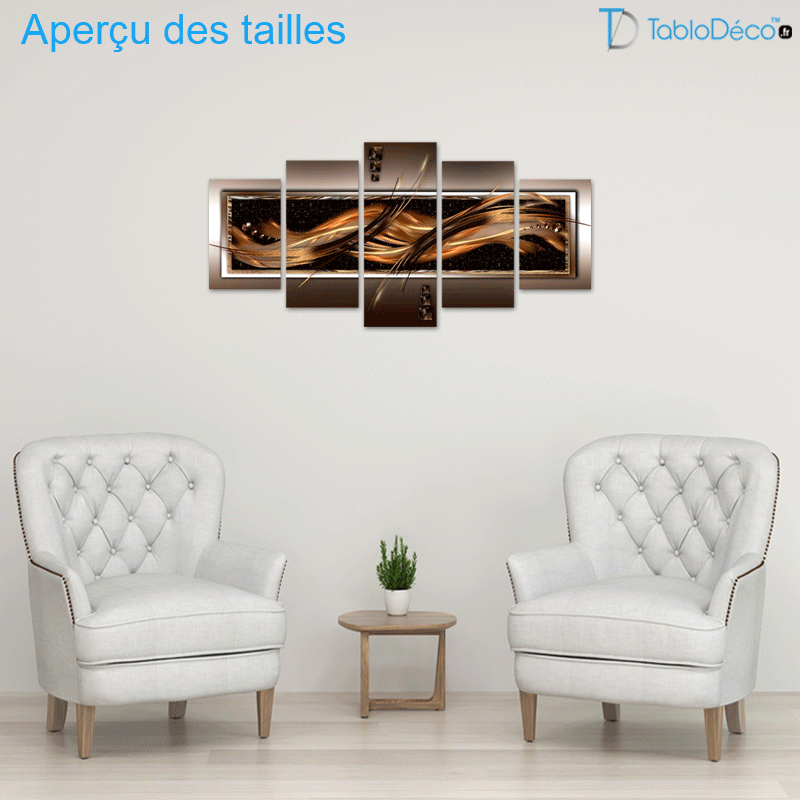 Ce tableau abstrait taupe et or au design élégant est parfait pour décorer votre salon. Une ambiance moderne grâce à une toile de qualité imprimée sur 5 panneaux aux tons dorés.