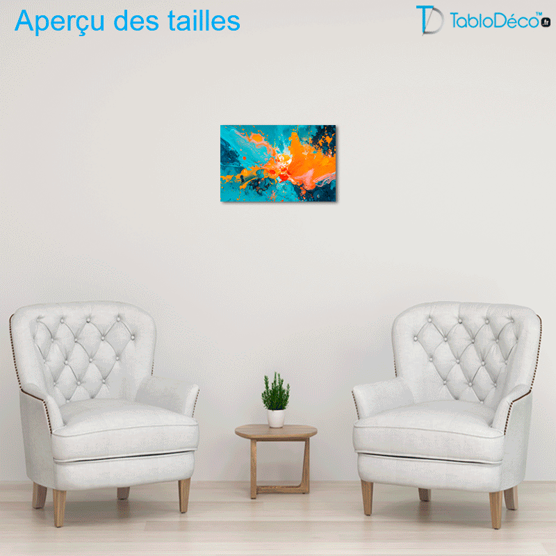 Plongez dans un univers d'énergie et de sérénité avec ce tableau abstrait bleu et orange, où les nuances de bleu et d'orange se rencontrent en une danse dynamique. Ce type de tableau sur toile abstrait capture l'essence de l'émotion à travers un tourbillon de couleurs vives et de formes fluides. C'est une œuvre d'art parfaite pour ceux qui souhaitent insuffler de la vitalité tout en maintenant une atmosphère apaisante dans leur espace.