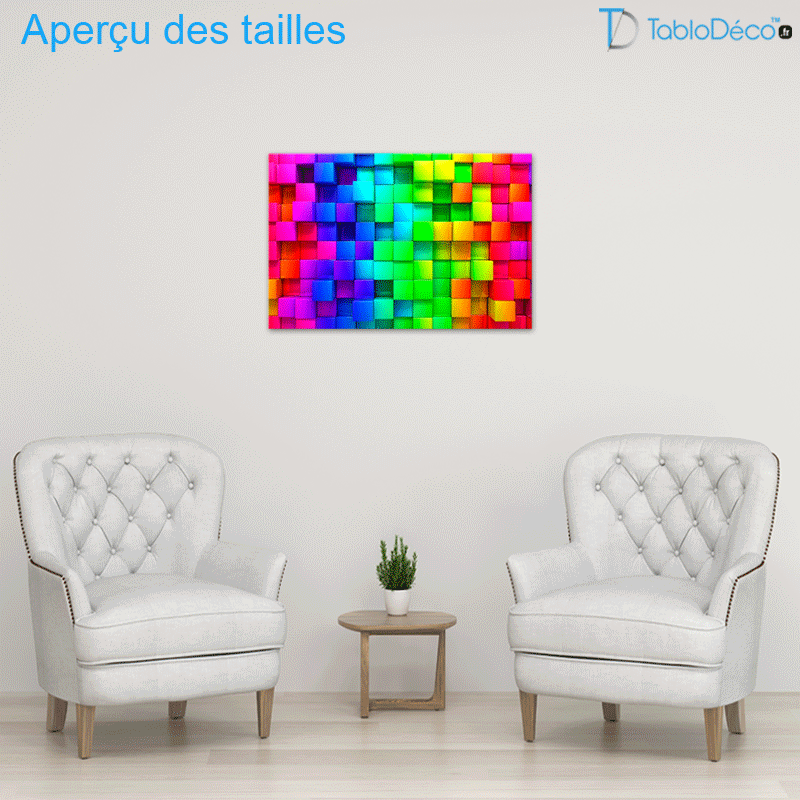 Optez pour ce tableau moderne qui vous permettra d’apporter beaucoup de joie et de gaieté dans votre intérieur. D’un fond avec de nombreux cubes et imprimé avec des couleurs vives (violet, bleu, vert), il est magnifique et très élégant et invite à la bonne humeur.
