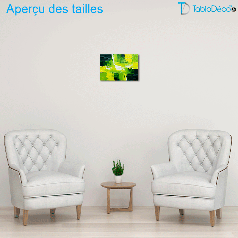 L'intérêt de ce tableau abstrait vert est d'abord son graphisme. Notamment par des d'effets de peintures vertes. Valorisée par plusieurs teintes de vert, la toile imprimée verte de style abstrait invite à se projeter dans un coin nature ressourçant et égaye nos intérieurs urbains.