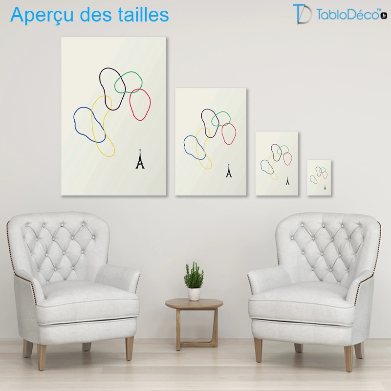 Cette toile de décoration des JO de Paris révèle une interprétation très moderne des cinq anneaux olympiques. La tour Eiffel, en contrebas, symbolise Paris et la France, temple des Jeux le temps d’un été. Les anneaux représentent les cinq continents . Le bleu symbolise l’Europe, le jaune l’Asie, le noir l’Afrique, le vert l’Océanie et le rouge l’Amérique. Le fond blanc de la toile nous rappelle le drapeau olympique, symbole de l’universalité des JO.