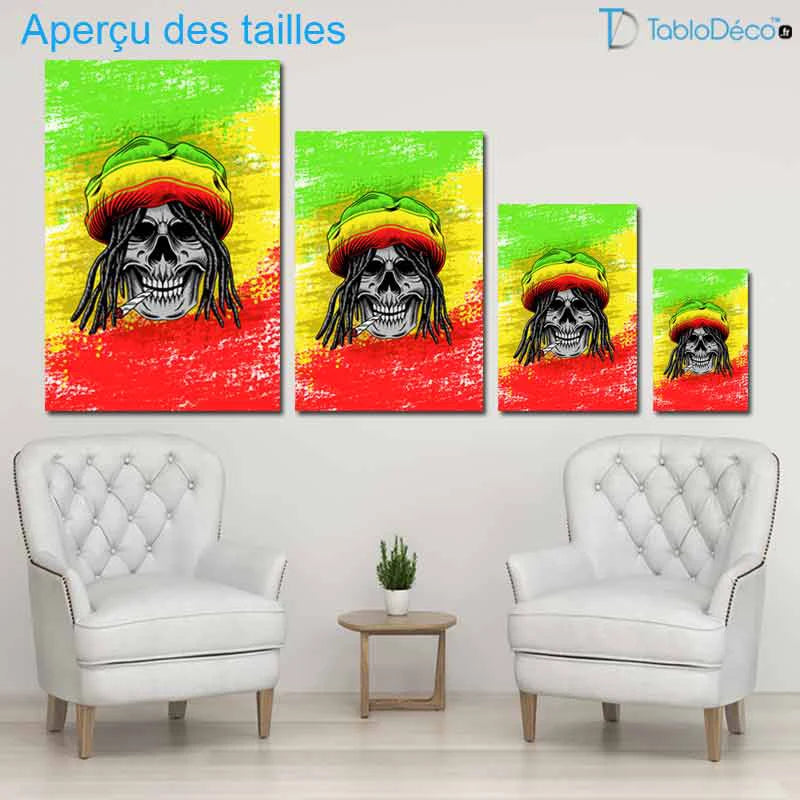 Avec ce superbe tableau de décoration, vous allez pouvoir décorer ou redécorer votre intérieur de façon originale et unique. Ce tableau rasta tête de mort va être la pièce maitresse de votre déco et va surprendre vos invités à coup sûr. Marquez votre différence en accrochant cette toile rasta chez vous. En achetant ce cadre décoratif coloré vous avez la garantie de la qualité du rendu sur la toile et du savoir faire TabloDéco.