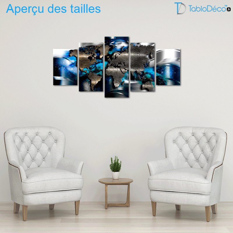 Ce tableau carte du monde possède un design bien unique. En effet, il s’agit d’un tableau décoratif en 5 panneaux présentant un planisphère formé avec les continents en effet métal (argenté ou doré). Tout ceci bien mis en valeur avec un fond bleu ou rouge. Les couleurs de ce tableau s'accorderont parfaitement à votre intérieur et vos envies. Ce tableau mural vous plaît ? Alors passez votre commande au plus vite, la livraison est offerte.