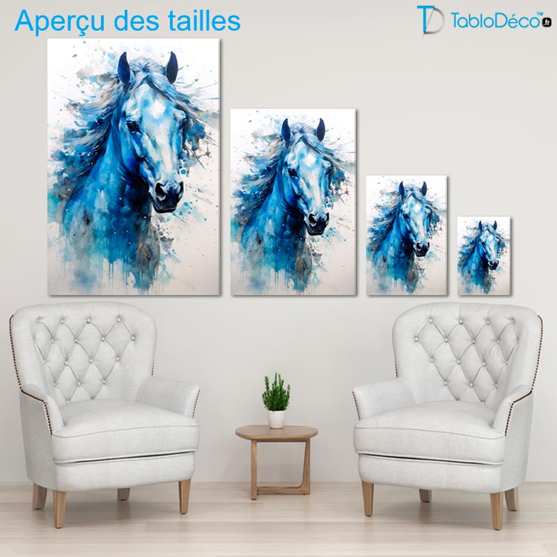 Cette toile d’un cheval bleu va apporter de la luminosité et une touche de sérénité à votre lieu de vie. Le bleu est le symbole de l’apaisement et du rêve. Cette couleur évoque la loyauté du compagnon de l’homme le plus représenté depuis la préhistoire.