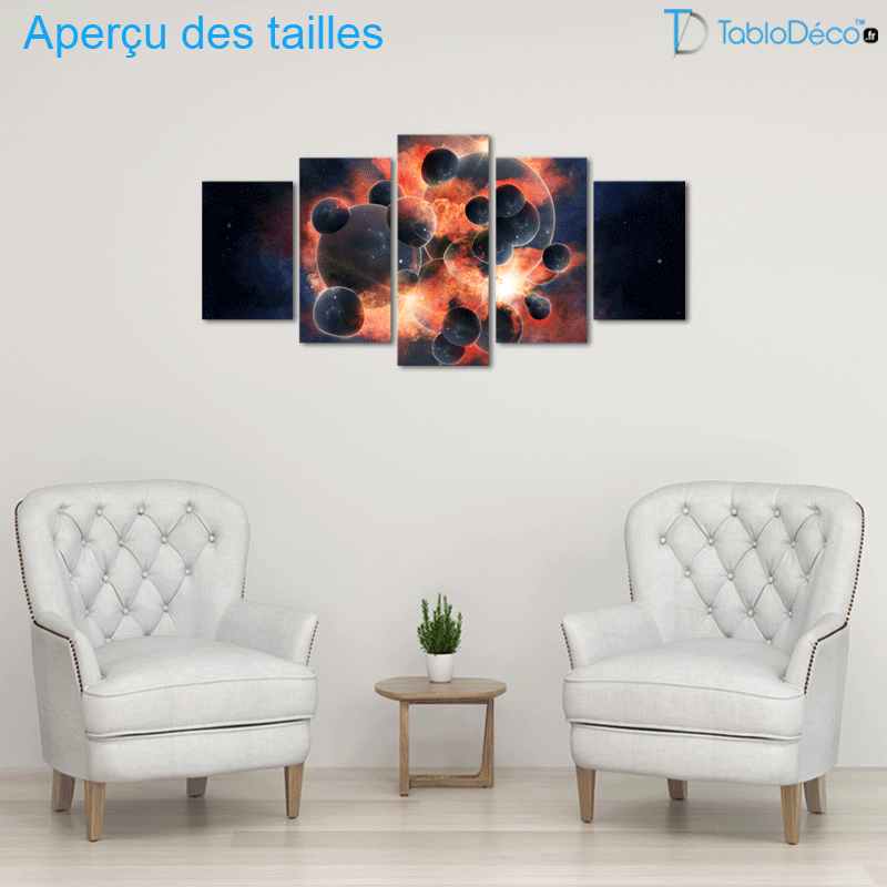 C'est ce genre de sentiment et d'impression que vous fera ressentir cette magnifique et impressionnante toile murale représentant une explosion cosmique dans l'univers. Ce set de toiles murales est au total composé de 5 panneaux cosmiques à attacher sur un mur, dans votre chambre ou dans votre salon, à admirer et à contempler.