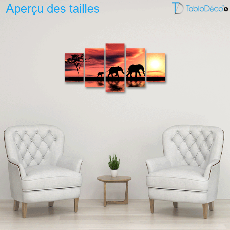 Trouvez la force et la beauté de la famille dans ce tableau d'une famille éléphants. Avec ce décor mural captivant, admirez ces trois éléphants sur 5 panneaux, dans un coucher de soleil orangé magnifique pour une ambiance chaleureuse. Une touche sauvage et animale idéale pour votre intérieur. Cette toile décorative avec des éléphants est imprimée sur une toile de coton tissé. Ce qui offre une impression optimale et intense des couleurs. La qualité de fabrication permet de conserver la beauté de ce tableau pour des années.