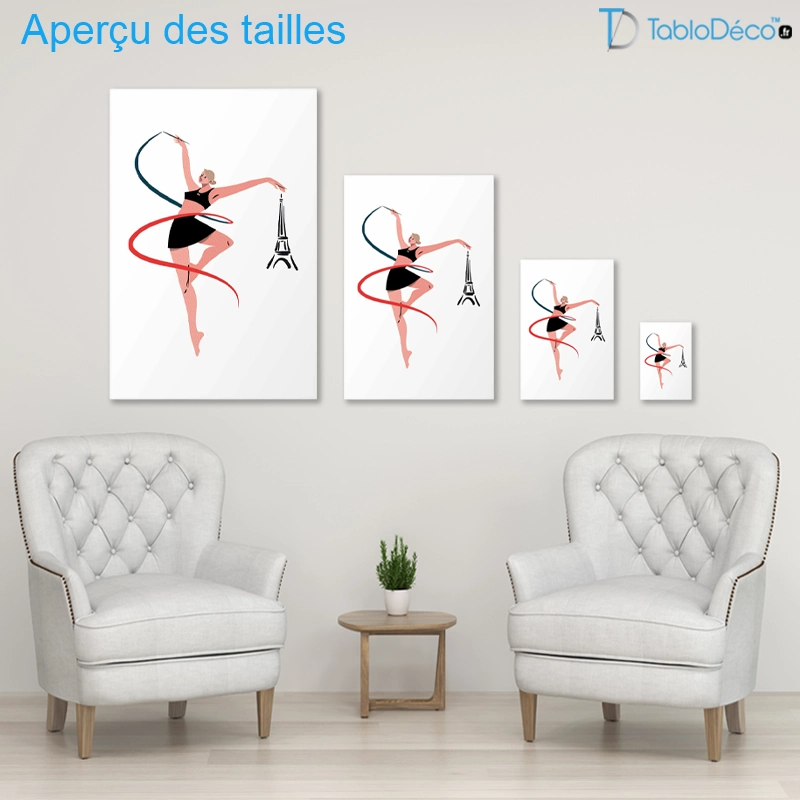 Illuminez votre intérieur avec ce tableau représentant une sportive qui pratique la gymnastique rythmique aux JO 2024. Cette œuvre célèbre l’une des disciplines féminines de la compétition. Une gymnaste enchaîne un mouvement délicat, enlacée par son ruban. Sur cette toile décorative au fond blanc, le bleu et le rouge rappellent les couleurs de notre drapeau. L’artiste rend hommage à Paris, symbolisée par la Dame de fer, qui veille au loin sur la sportive. La France est devenue le temple des JO de l’été 2024. La majorité des épreuves ont lieu à Paris et ses alentours.