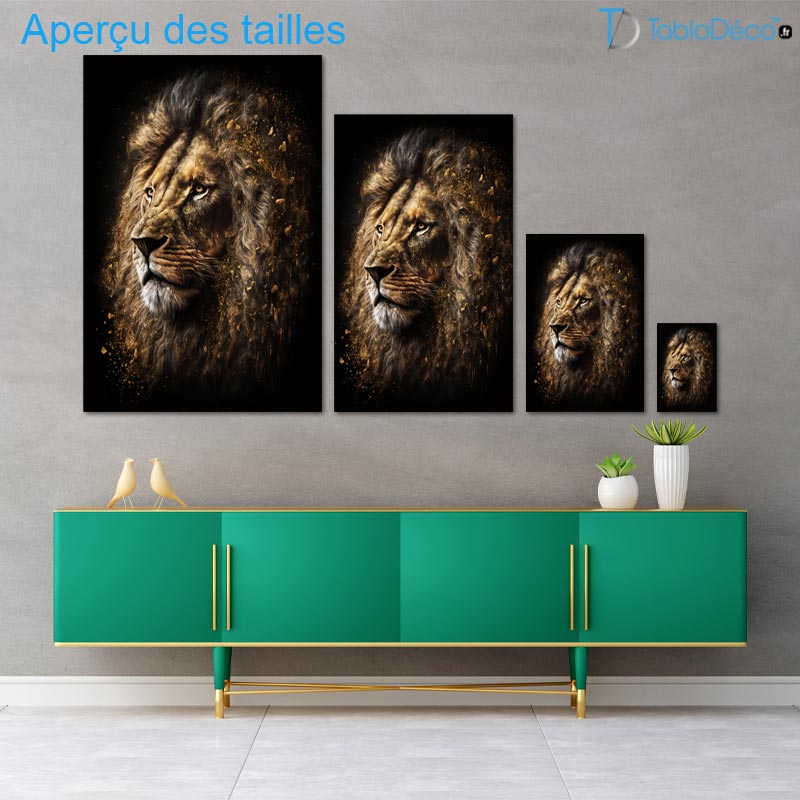 Le salon est un endroit spécial. C'est un lieu dédié à la détente, aux retrouvailles en famille, et aux bons moments entre amis. On a tendance à y accrocher des tableaux qui nous plaisent et reflètent notre personnalité. Alors, pourquoi ne pas ajouter un tableau de lion doré à votre décoration ? Ce tableau avec un animal majestueux trouvera parfaitement sa place dans un salon. Il évoque l'aventure, mais aussi le courage et la beauté de la nature. Il suffit de poser son regard sur ce lion sur fond noir pour se sentir comme dans une savane lointaine, où les lions règnent en maîtres.