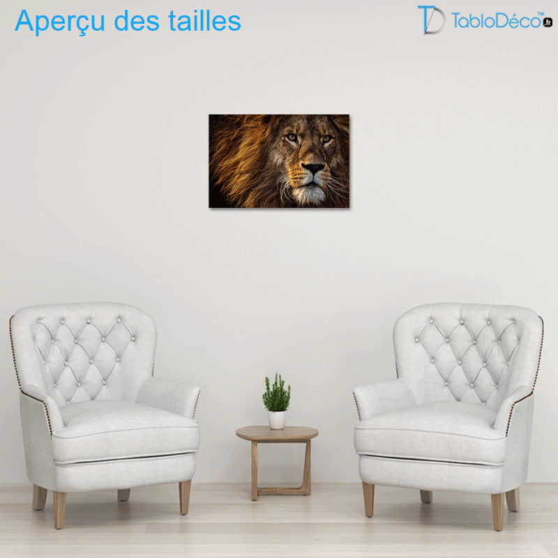 Avec cette photo toile représentant un lion, TabloDéco a la solution pour que vous vous sentiez mieux chez vous. Disponible en quatre formats, vous lui trouverez forcément une place pour que la puissance du lion rayonne dans votre maison.