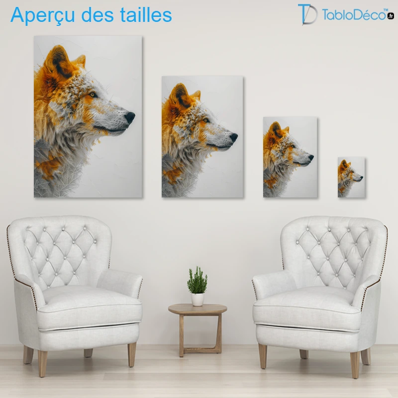 L’animal du Grand Nord veille sur votre intérieur dans ce tableau avec un loup aux touches graphiques. Ce loup majestueux à la flamboyante fourrure rousse et blanche se dévoile de profil. Sur un fond blanc, son pelage se pare de feuilles givrées.