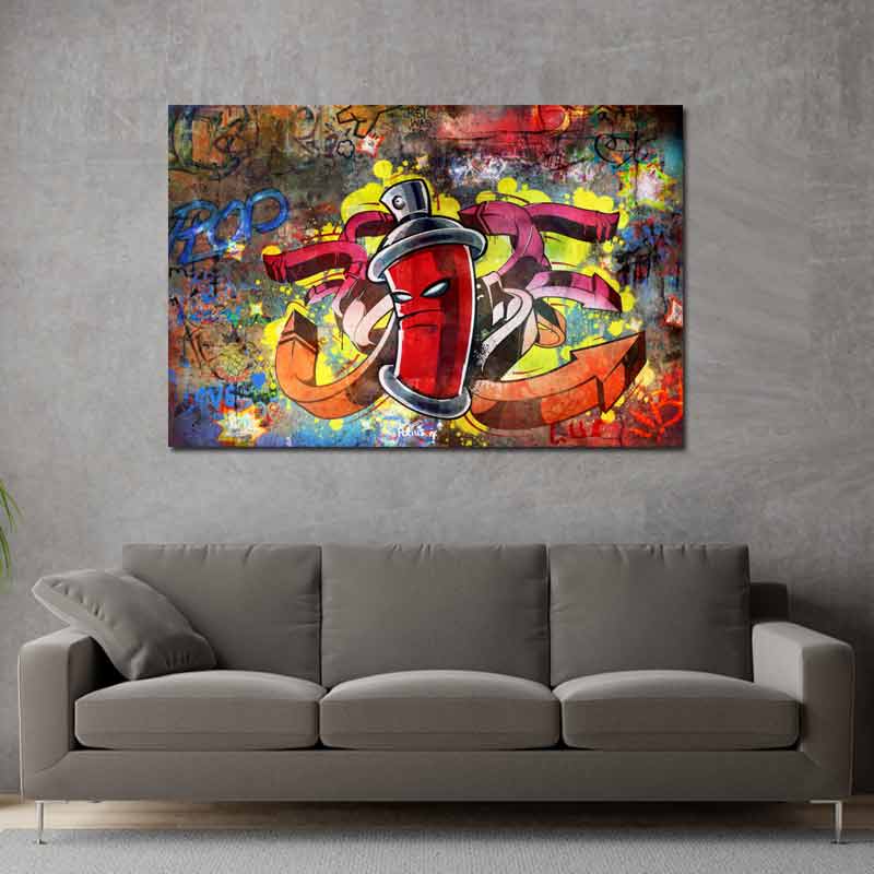 Une toile imprimée à la façon d'un graffiti urbain est un choix parfait pour apporter une touche de modernité graphique à son intérieur. Une décoration murale multicolore, comme ce tableau street art graffiti, permet de facilement personnaliser ses murs.