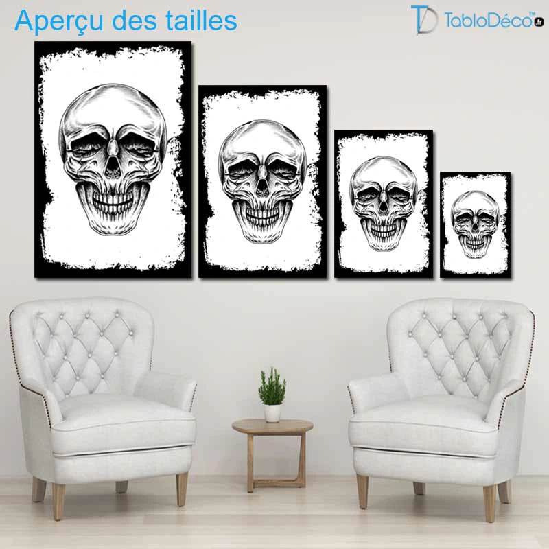 Installez chez vous un décor original avec ce tableau tête de mort en noir et blanc. C’est un classique très envié et convoité. Son style décalé bicolore met en lumière le travail de notre artiste. Le tableau tête de mort est imprimé sur une toile résistante et écologique. Le rendu de grande qualité va vous offrir un visuel unique. Grâce à cette toile décorative tête de mort en noir et blanc, vous allez bénéficier d'un savoir faire et d'une décoration murale design pour votre pièce préférée.