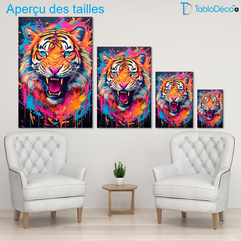 Plusieurs formats au choix : Ce tableau tigre multicolore vous est proposé en 4 formats pour s’adapter à tous les murs.