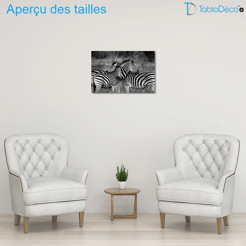 Ajoutez une touche sauvage à votre déco avec ce superbe tableau de zèbres de dos. Toile imprimée à partir d'une photo de zèbres sauvages restant aux aguets. Ce tableau avec des zèbres créera une atmosphère de safari pour une chambre d'enfant par exemple. Fabriqué en France avec des matériaux de qualité, ce tableau mural sera l'objet de décoration intemporel dans des tons noirs et blancs qui plaira aux plus grands et aux plus petits.