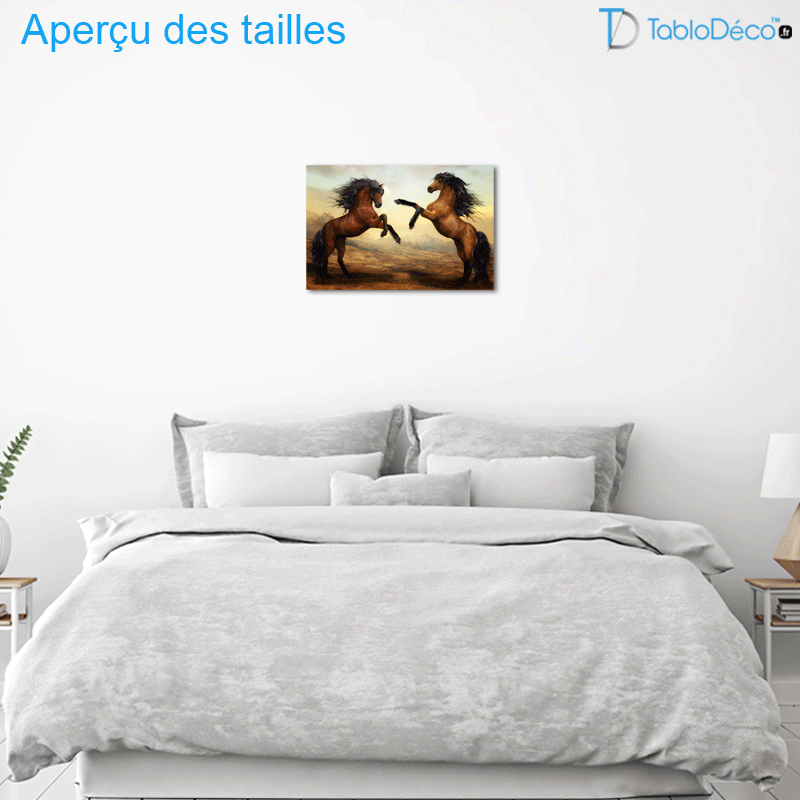 Cerise sur le gâteau, plusieurs tailles sont disponibles pour vous permettre de trouver celle qui ira le mieux avec votre décoration d'intérieur actuelle. Pour se faire plaisir ou pour offrir, les tableaux sur les animaux sont la garantie de faire une personne heureuse que cela soit vous ou à un proche. La robe de ces deux étalons, noir et marron, sur un fond gris intense, se mariera parfaitement sur toutes les couleurs de mur et tous les types de décoration et de mobilier.
