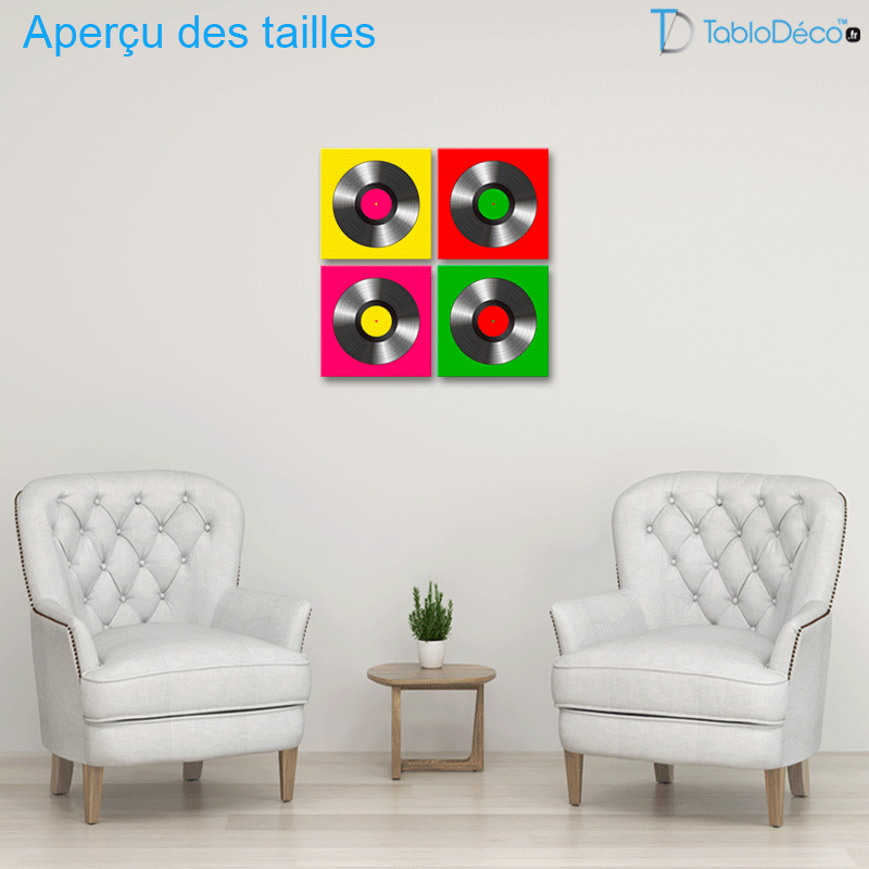 Ils peuvent être disposés comme bon vous semble, et vont parfaitement s’intégrer à une décoration rétro. C’est l’occasion de donner à votre salon un style inimitable grâce à ce tableau style pop art dont les couleurs mettent immédiatement de bonne humeur, et donnent envie de passer la journée en musique.