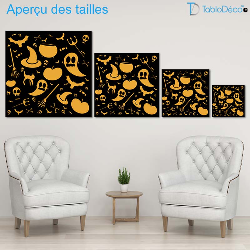 Et si votre décoration se mettait aux couleurs d’Halloween ? Cette toile décorative pour Halloween est à la fois terrifiante et parfaite pour une touche de frisson dans votre maison hantée. Un cadre bicolore avec des éléments monstrueux et maléfiques orangés sur un fond noir.